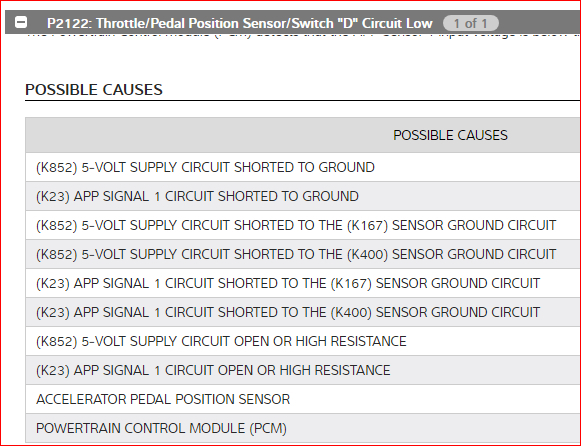 Dash warning light (electronic throttle control system). Scanner gives code P2122. Throttle/pedal position sensor/switch D circuit low.