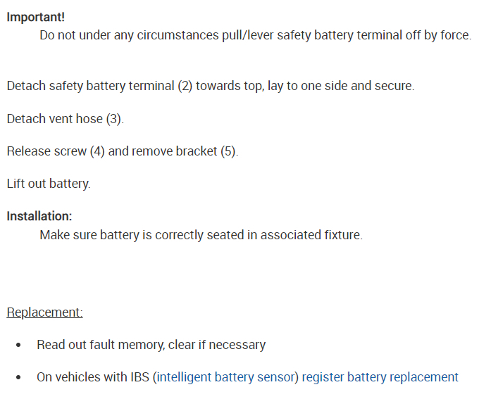 Vehicles with the automatic engine start-stop function or particular engine types and optional equipment are equipped with a special vehicle battery (AGM battery), since only this battery type can provide elevated power requirements over the extended service life. Installing a different vehicle battery can cause problems with vehicle electronics, can reduce functions or can cause leakage of battery acid.
