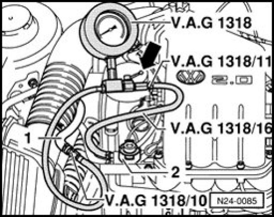 - Connect pressure gauge (V.A.G 1318) with adapters (V.A.G 1318/11) and (V.A.G 1318/16) to fuel rail -2-.