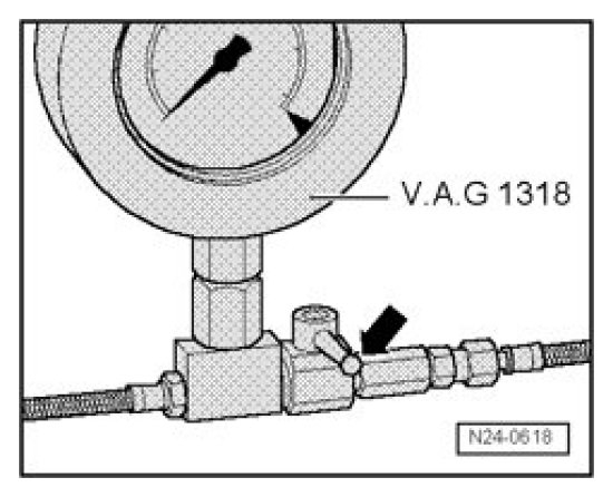 - Wait until pressure has dropped, and then switch off ignition. Simultaneously close pressure gauge shut-off valve (lever perpendicular to direction of flow -arrow-).