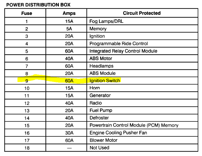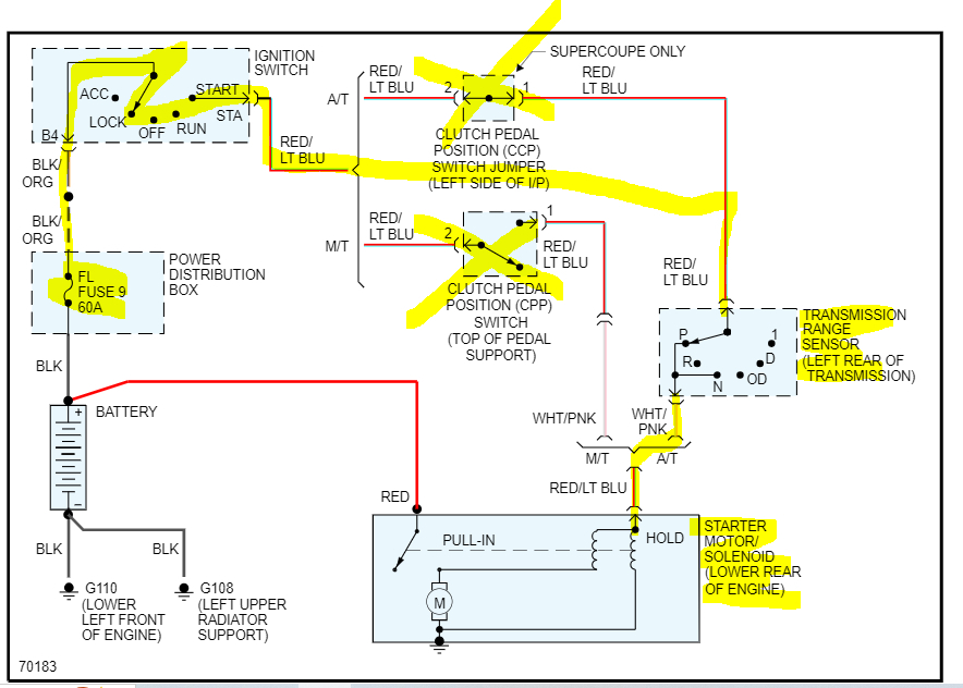 This is a very straight forward system. Power from fuse 9 in the power distribution box is sent to the ignition switch. From that point, it goes to the neutral safety switch and then the starter solenoid.