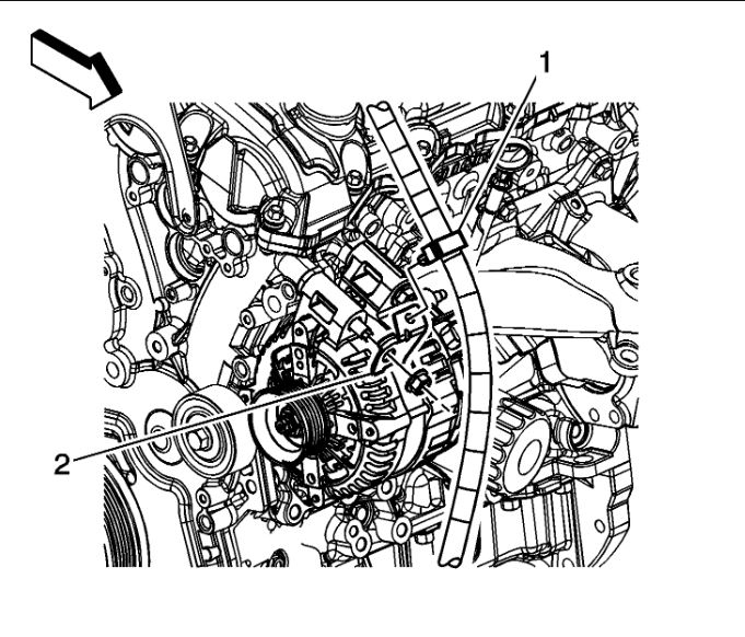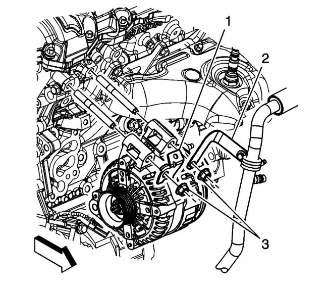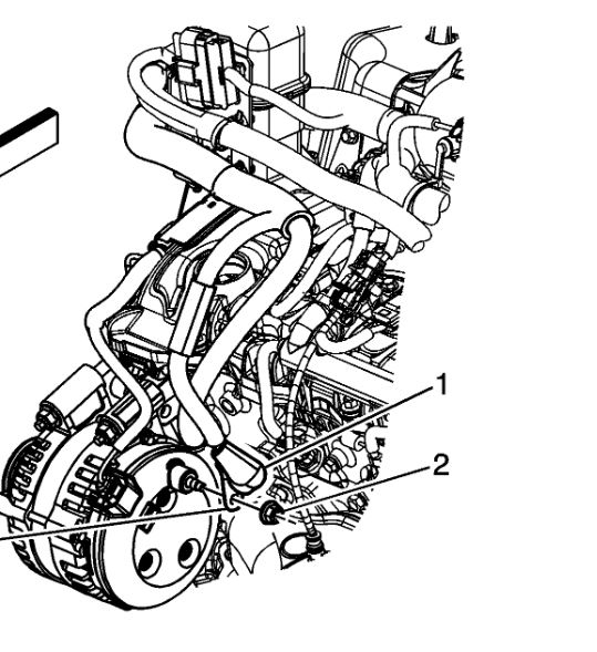 10. Remove the air conditioning (A/C) compressor/evaporator hose bracket (2) from the left generator stud.