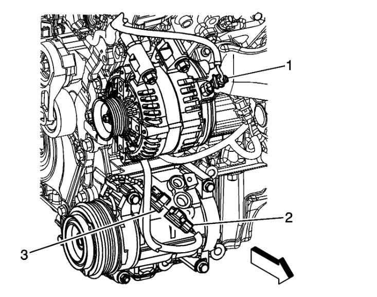 5. Remove the battery positive junction block cable terminal (3) from the generator stud.