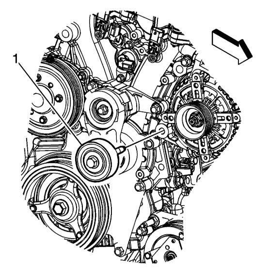 8. Loosen the idler pulley bolt (1) and slide the pulley out as far as possible.