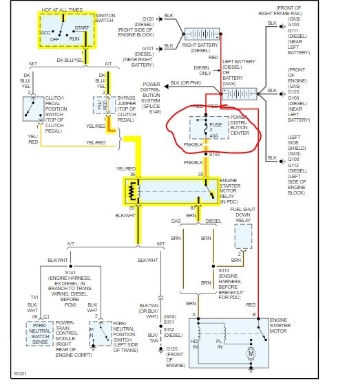I attached a wiring diagram of the starter circuit for you. We need to do some testing at the relay to see if the correct signals are present for the starter to work.