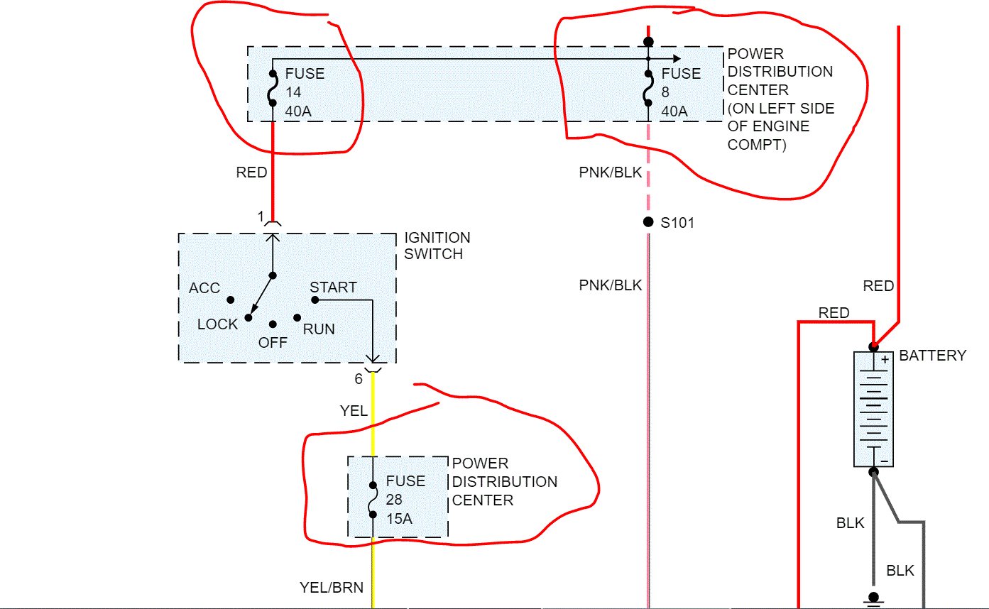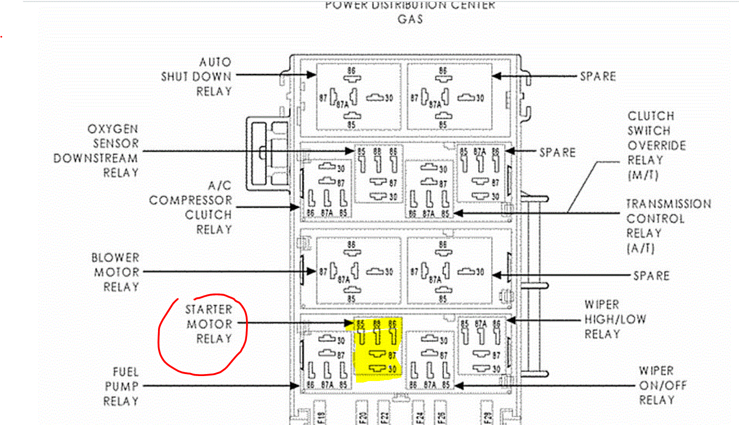 If it doesn't start in neutral, I need you to check three different fuses. All are located in the power distribution box (fuse box) under the hood. If you look at pic 1, it is part of the wiring schematic for the starter. I circled the fuses needing checked. Pic 2 shows their locations