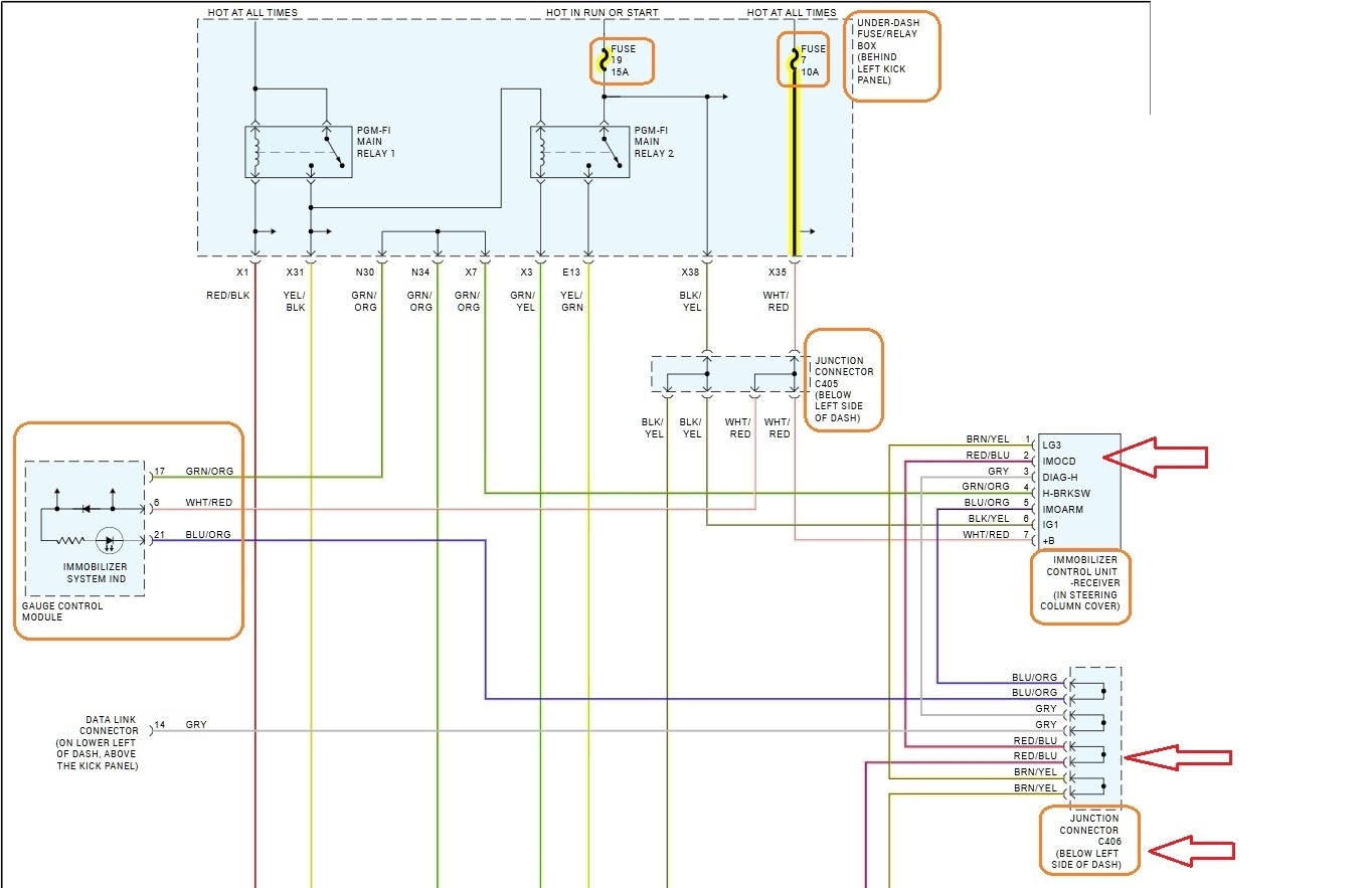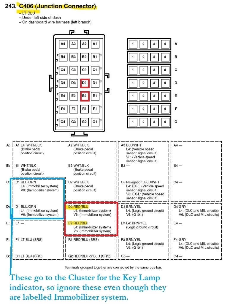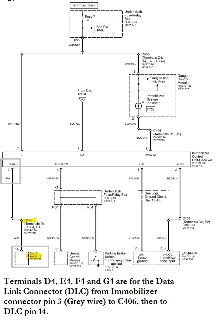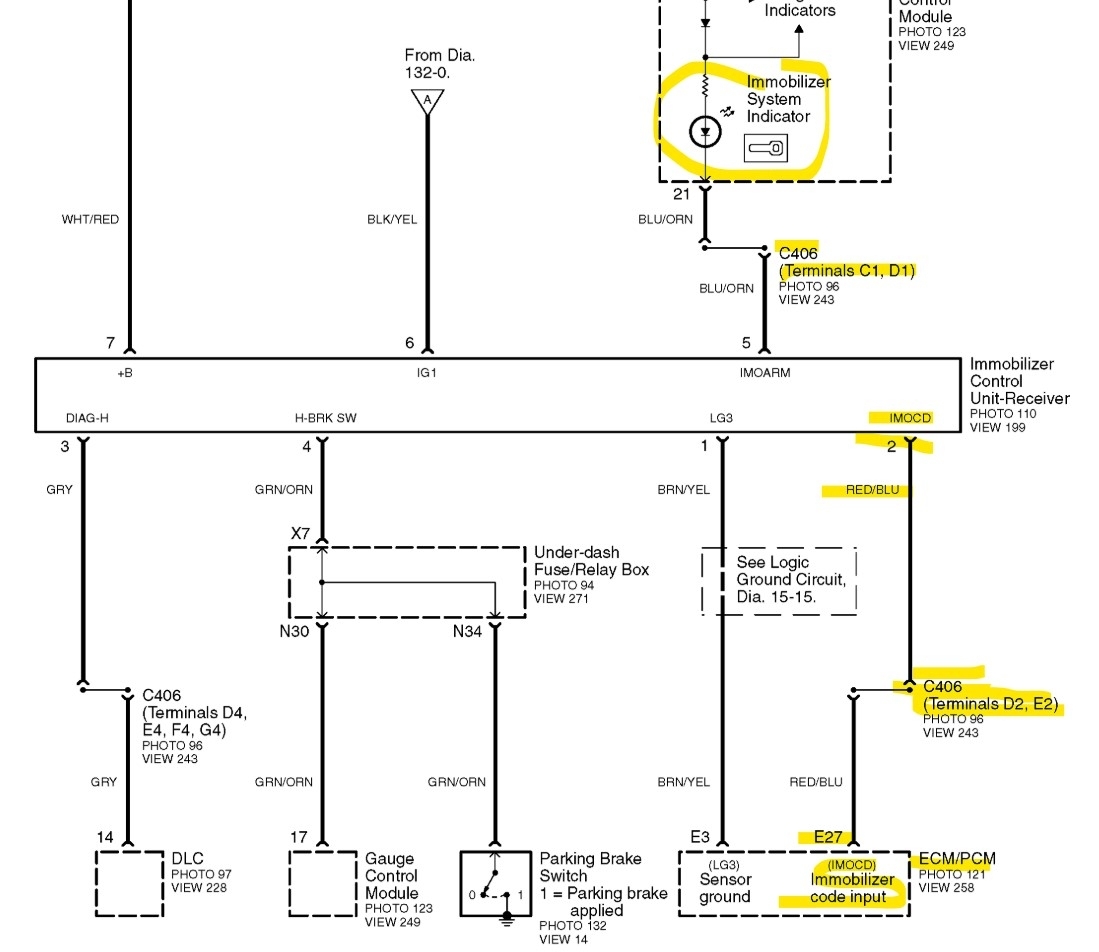 Okay, I had to go back and see where you are at by this point, so with the meter set on Ohms (resistance) setting, you have continuity between the ECM E27 connector/pin and the Immobilizer connector pin 2 red/blue wire? This would run through the C406 connector plugged in.