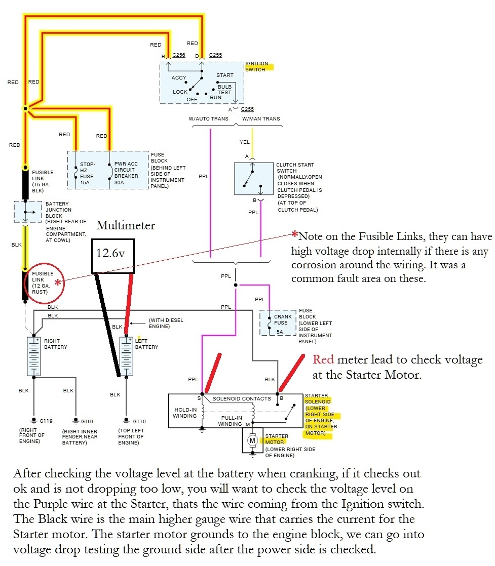 I will see what wiring diagrams there are for this year, but really you need to use a meter set to DC volts and see what the battery is reading when attempting to crank it over, if the battery voltage stays above at least 9volts or so (battery voltage will drop temporarily when cranking, but should recover right away back to 12.6volts). If the battery checks out ok when cranking, youre going to want to check the voltage at the Starter motor when someone is turning the key for you. Any number of issues can cause voltage issues like this, especially on an older vehicle like this. Frame to body grounds go bad, engine block grounds get corroded and rusted causing a voltage drop on the ground side, so you see we need to know some voltage numbers.