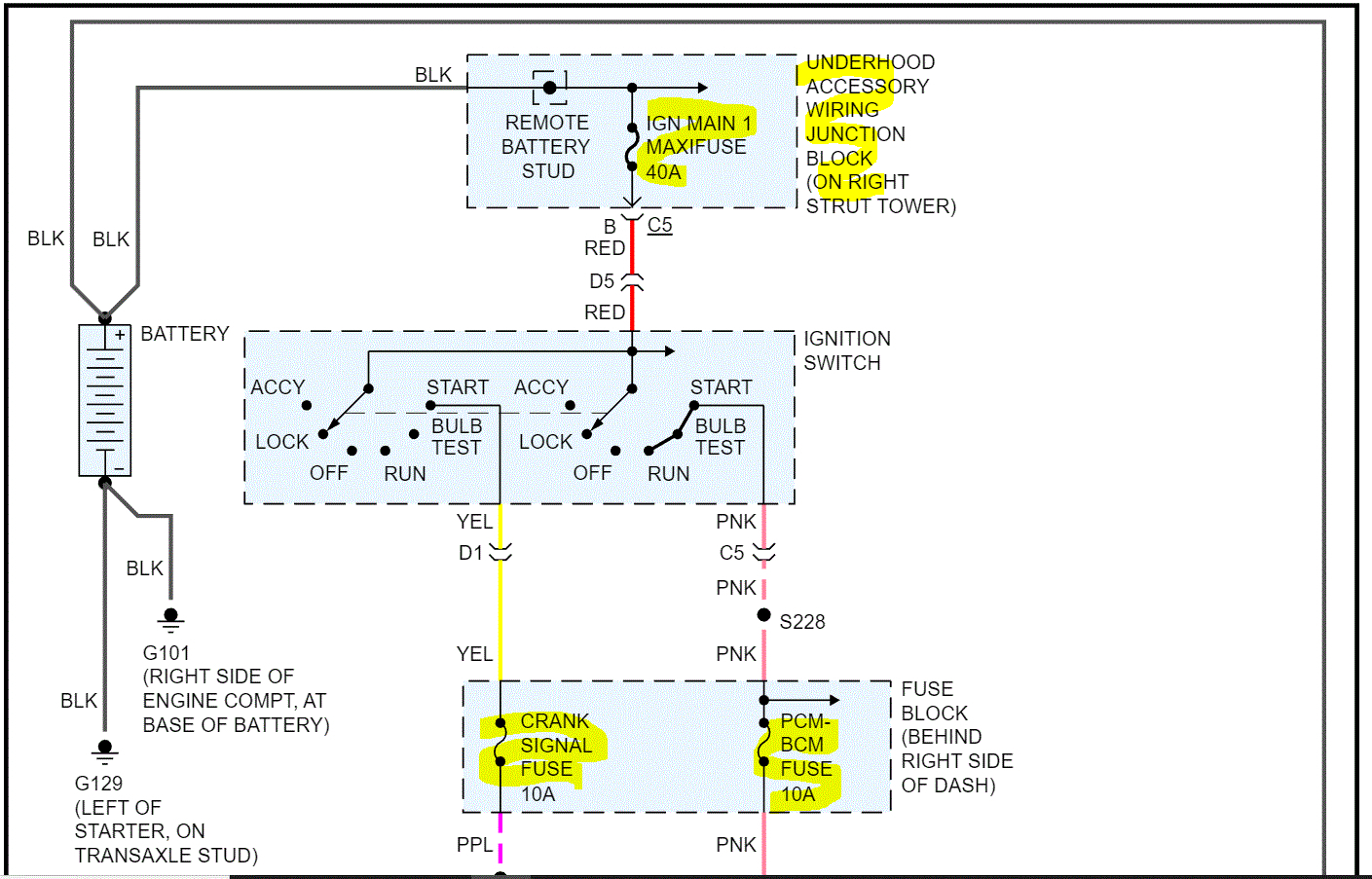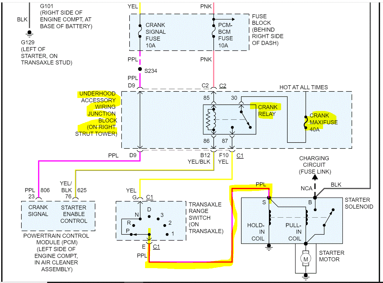 If that doesn't help, then we need to look at the wiring and power supplies. If you look below, I attached the wiring schematic for the starting circuit. Note there are several different fuses that are involved and a starter relay. Start by checking the fuses I highlighted. Note: In addition to checking the fuses, it is important to confirm there is power to and from them. Here is a link you may find helpful: