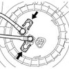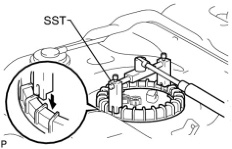 (d)Put the retainer on the fuel tank. While holding the fuel suction with pump and gauge tube assembly, tighten the retainer one complete turn by hand.