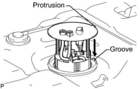 (b)Align the protrusion of the fuel suction with pump and gauge tube assembly with the groove of the fuel tank.