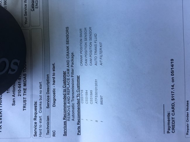 My vehicle has problems starting. Only after multiple attempts (5+), it starts.I took it to a place (Midas), where I was told it was the crank and cam sensors. I was told after they are replaced it would start. The charge would be $800.00 (parts/labor).I replaced my crank position sensor as well as both cams, myself (to save money), but I am having the same problem, except now it won’t turn over at all. What did I do wrong? I ordered the right parts. When I try to start it, nothing happens, but when I remove the key, I hear clicking.