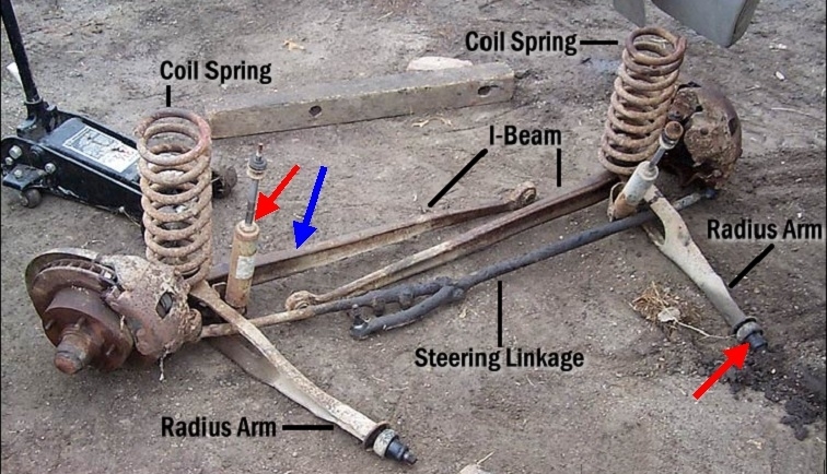 Due to the single geometric angle the system can go through, suspension ride height is critical in reducing the miserable tire wear. As the coil springs sag from age, both front wheels will tip in on top, (that's camber), and that will cause accelerated tire wear on the inner edge of that tire. The only vehicle that has worse tire wear is the Bronco 2 because its I-beams are so short. The poor design is real easy to see when the vehicles are raised on a hoist. Both front wheels will be tipped out on top a real lot. That inward and outward tilt is the range the tires go through as the vehicle bounces up and down as it goes down the road.