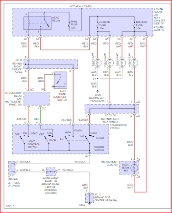 But on high beam all four headlights work. So I figure all four bulbs and fuses are good. From the circuit diagrams I have found on the net, this seems an unlikely situation (unless I have the wrong circuit diagrams!). Note, that there are no day time running lights on this car.