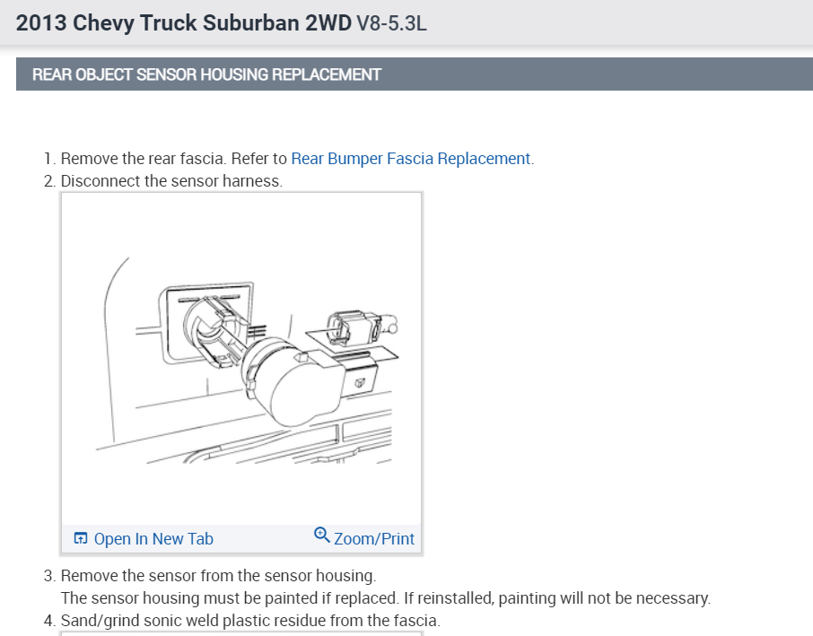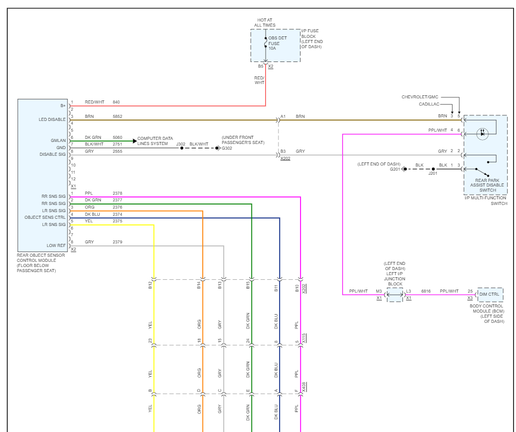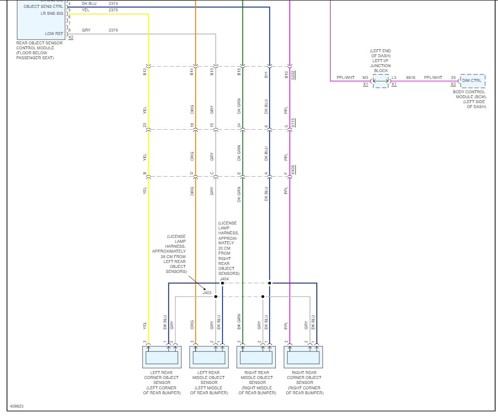 The side object sensors are each located behind the rear fascia, positioned so that the sensor is pointing out toward the opposite lane. Each sensor is supplied B+ and ground. The right sensor receives an additional ground. Both sensors communicate independently on the serial data line. The serial data enters the left sensor in a pass-thru configuration, that connects to the right sensor. The scan tool is able to individually communicate with each sensor.